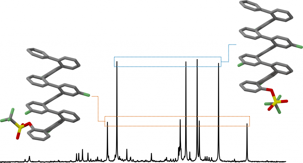 1H NMR spectroscopy is a powerful tool for the conformational analysis of ortho-phenylene foldamers in solution. However, as o-phenylenes are integrated into ever more complex systems, we are reaching the limits of what can be analyzed by 1H- and 13C-based NMR techniques. Here, we explore fluorine labeling of o-phenylene oligomers for analysis by 19F NMR spectroscopy. Two series of fluorinated oligomers have been synthesized. Optimization of monomers for Suzuki coupling enables an efficient stepwise oligomer synthesis. The oligomers all adopt well-folded geometries in solution, as determined by 1H NMR spectroscopy and X-ray crystallography. 19F NMR experiments complement these methods well. The resolved singlets of one-dimensional 19F{1H} spectra are very useful for determining relative conformer populations. The additional information from two-dimensional 19F NMR spectra is also clearly valuable when making 1H assignments. The comparison of 19F isotropic shielding predictions to experimental chemical shifts is not, however, currently sufficient by itself to establish o-phenylene geometries.